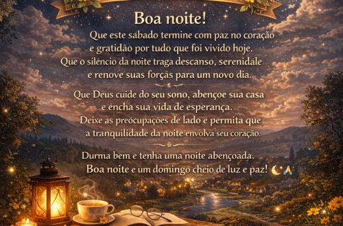 🌙 Mensagem de Boa Noite – Sábado Boa noite!Que este sábado termine com paz no coração e gratidão por tudo que foi vivido hoje. Que o silêncio da noite traga descanso, serenidade e renove suas forças para um novo dia. Que Deus cuide do seu sono, abençoe sua casa e encha sua vida de esperança. Deixe as preocupações de lado e permita que a tranquilidade da noite envolva seu coração. Durma bem e tenha uma noite abençoada.Boa noite e um domingo cheio de luz e paz! 🌙✨🙏