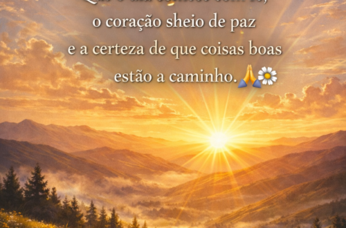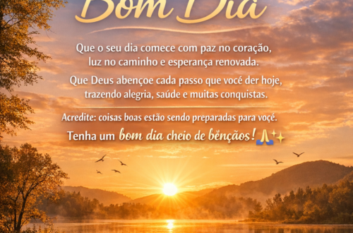 1. Bom dia! Que este novo amanhecer traga paz ao seu coração e esperança para a sua caminhada. Que cada passo dado hoje seja guiado pela luz de Deus e que você encontre motivos para sorrir em cada pequeno detalhe da vida. 2. Bom dia! A vida sempre nos oferece uma nova chance a cada amanhecer. Que hoje seja um dia de recomeços, de fé renovada e de muitas bênçãos sobre a sua vida e a sua família. 3. Que o seu dia comece com gratidão, continue com alegria e termine com paz. Que Deus ilumine seus caminhos e que cada momento de hoje seja cheio de boas surpresas. Bom…