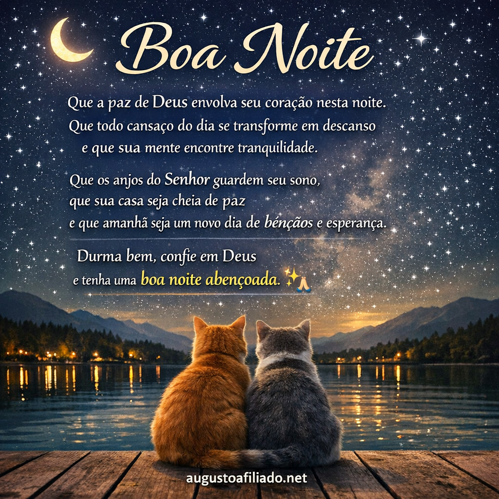 🌙 Mensagem de Boa Noite Que a paz de Deus envolva seu coração nesta noite.Que todo cansaço do dia se transforme em descansoe que sua mente encontre tranquilidade. Que os anjos do Senhor guardem seu sono,que sua casa seja cheia de paze que amanhã seja um novo dia de bênçãos e esperança. Durma bem, confie em Deuse tenha uma boa noite abençoada. ✨🙏