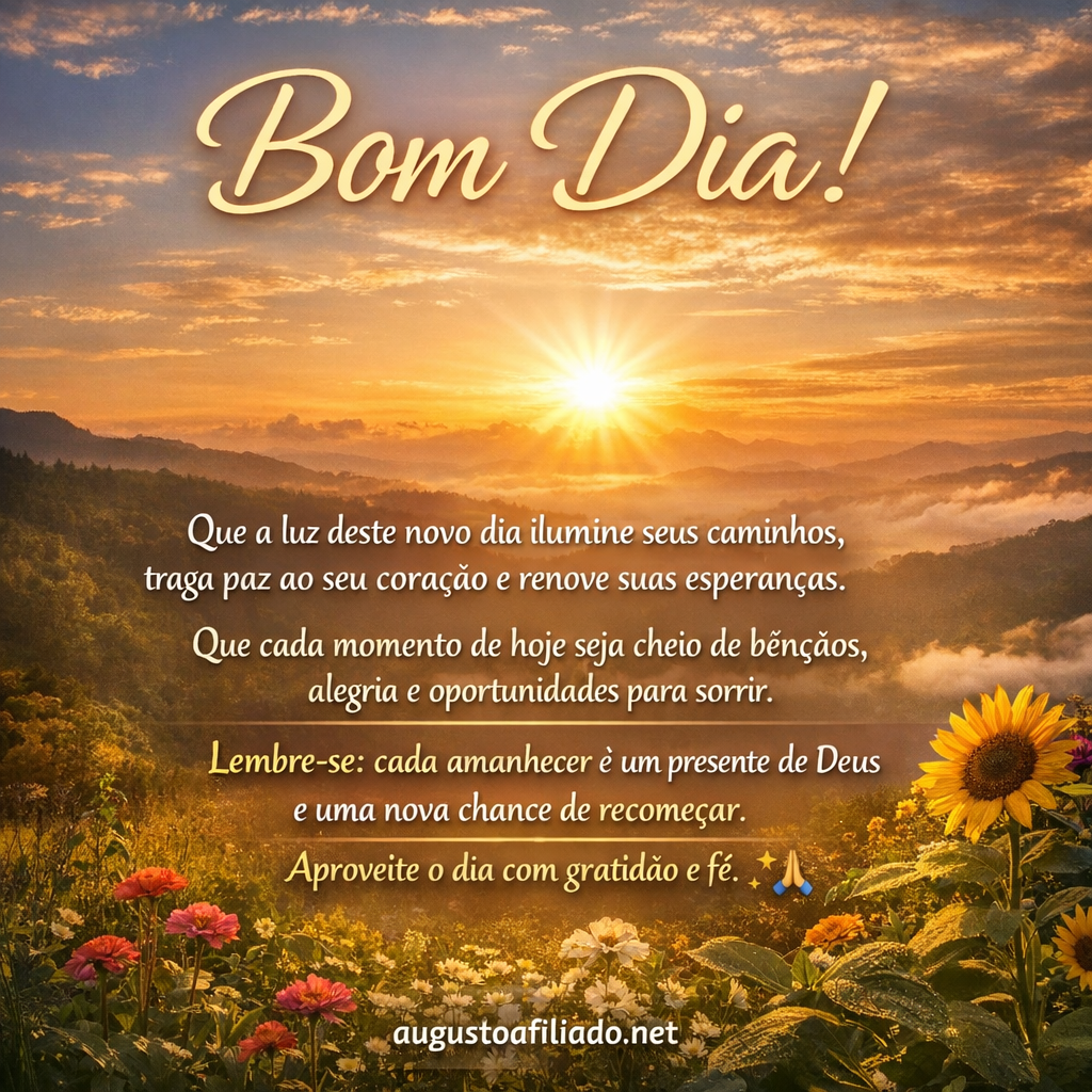 1. Bom dia! Que este novo amanhecer traga paz ao seu coração e esperança para a sua caminhada. Que cada passo dado hoje seja guiado pela luz de Deus e que você encontre motivos para sorrir em cada pequeno detalhe da vida. 2. Bom dia! A vida sempre nos oferece uma nova chance a cada amanhecer. Que hoje seja um dia de recomeços, de fé renovada e de muitas bênçãos sobre a sua vida e a sua família. 3. Que o seu dia comece com gratidão, continue com alegria e termine com paz. Que Deus ilumine seus caminhos e que cada momento de hoje seja cheio de boas surpresas. Bom…