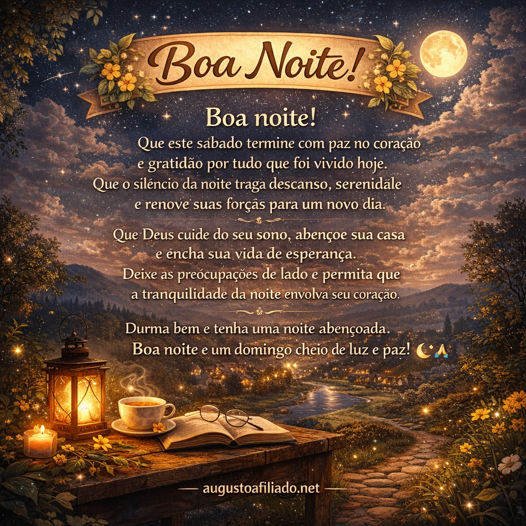 🌙 Mensagem de Boa Noite – Sábado Boa noite!Que este sábado termine com paz no coração e gratidão por tudo que foi vivido hoje. Que o silêncio da noite traga descanso, serenidade e renove suas forças para um novo dia. Que Deus cuide do seu sono, abençoe sua casa e encha sua vida de esperança. Deixe as preocupações de lado e permita que a tranquilidade da noite envolva seu coração. Durma bem e tenha uma noite abençoada.Boa noite e um domingo cheio de luz e paz! 🌙✨🙏