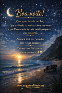 Boa Noite 2 de março de 2026 / Boa noite!Que a paz invada seu lar,que o silêncio da noite acalme sua mentee que Deus cuide de cada detalhe enquanto você descansa.Amanhã será um novo dia, com novas bênçãos.Durma com fé e acorde com esperança. 🙏💫