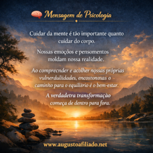 🧠 Mensagem de Psicologia “Cuidar da mente é tão importante quanto cuidar do corpo. Nossas emoções e pensamentos moldam nossa realidade. Ao compreender e acolher nossas próprias vulnerabilidades, encontramos o caminho para o equilíbrio e o bem-estar. A verdadeira transformação começa de dentro para fora.”