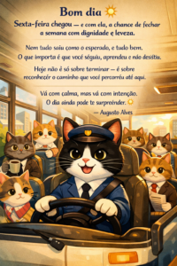 Sexta-feira chegou — e com ela, a chance de fechar a semana com dignidade e leveza.Nem tudo saiu como o esperado, e tudo bem. O que importa é que você seguiu, aprendeu e não desistiu. Hoje não é só sobre terminar — é sobre reconhecer o caminho que você percorreu até aqui.