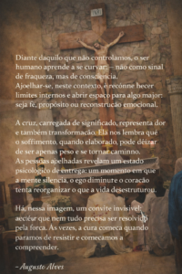A cruz, carregada de significado, representa dor e também transformação. Ela nos lembra que o sofrimento, quando elaborado, pode deixar de ser apenas peso e se tornar caminho. As pessoas ajoelhadas revelam um estado psicológico de entrega: um momento em que a mente silencia, o ego diminui e o coração tenta reorganizar o que a vida desestruturou.
