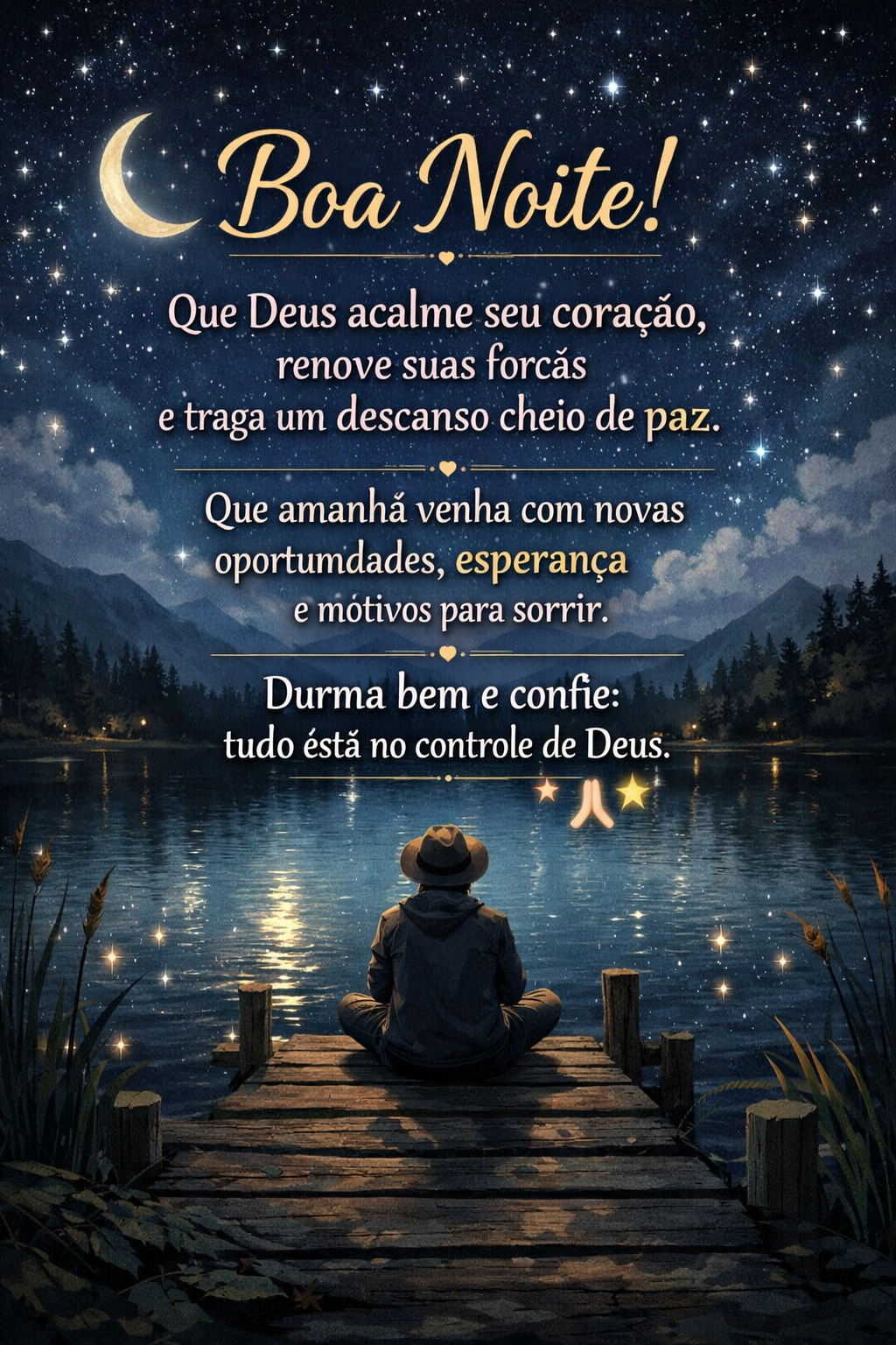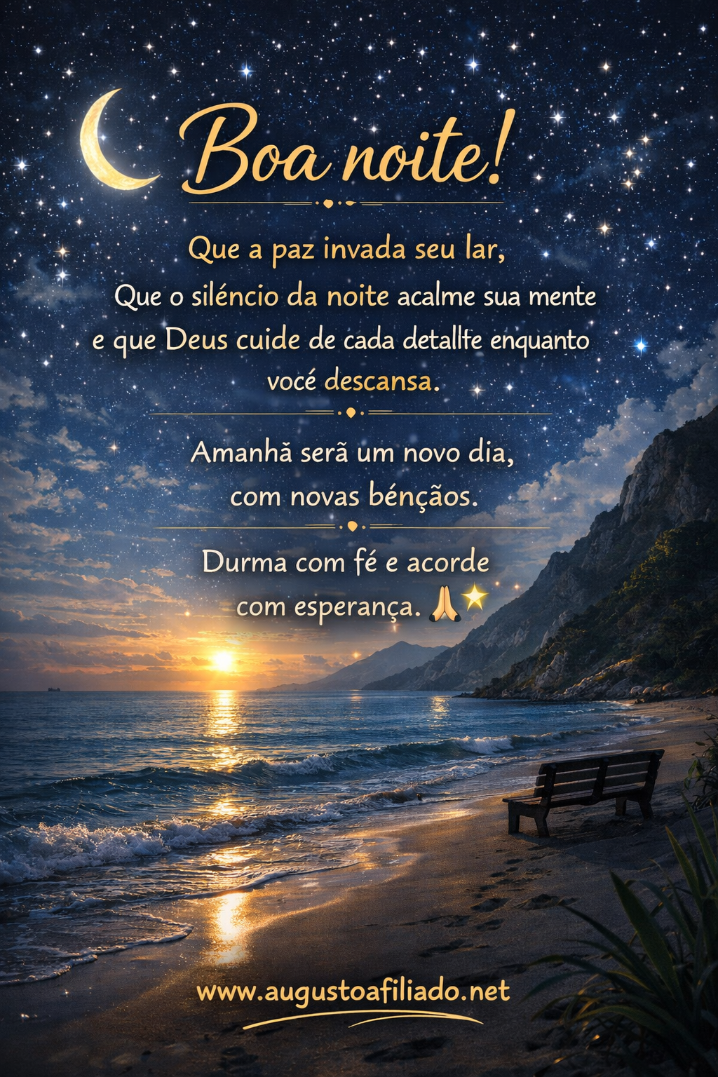 Boa noite!Que Deus acalme seu coração,leve embora todo cansaço do diae encha sua noite de paz e tranquilidade. Que os seus sonhos sejam leves,seu descanso seja profundoe que amanhã traga novas oportunidadese muitas bênçãos para sua vida. ✨ Durma bem e tenha uma noite abençoada!
