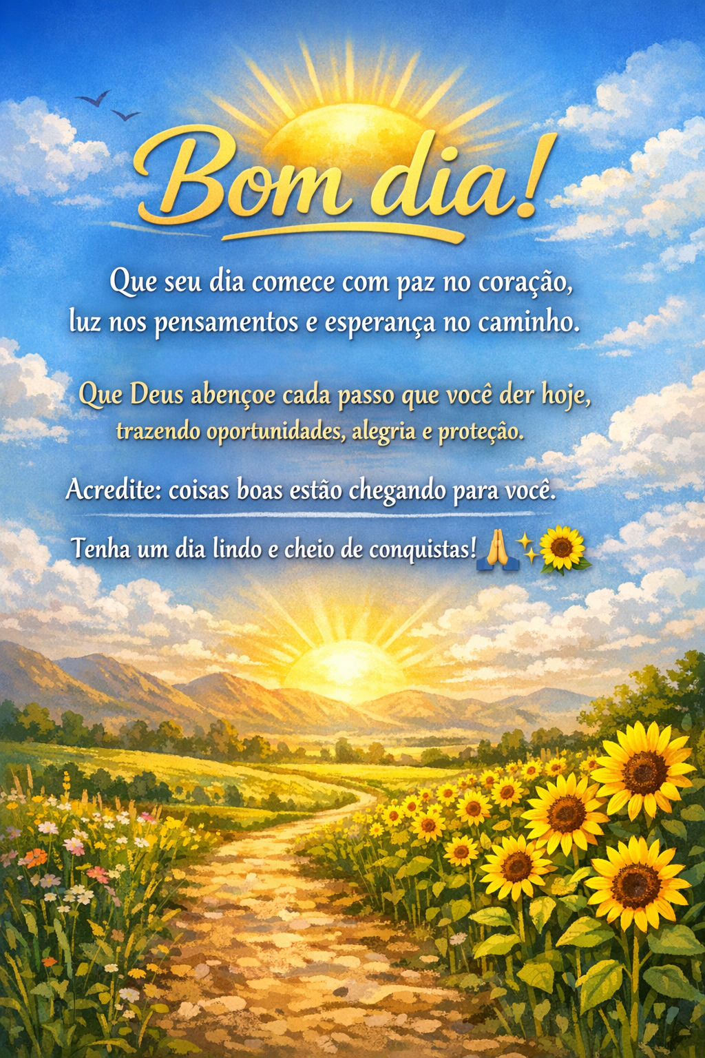☀️ Bom dia! Que seu dia comece com paz no coração,luz nos pensamentos e esperança no caminho. Que Deus abençoe cada passo que você der hoje,trazendo oportunidades, alegria e proteção. Acredite: coisas boas estão chegando para você.Tenha um dia lindo e cheio de conquistas! 🙏✨🌻