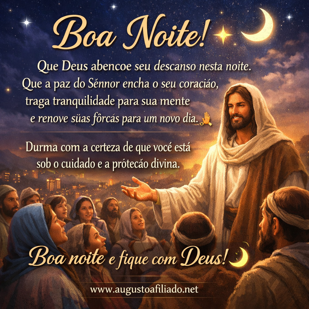 Boa noite!Que Deus acalme seu coração,leve embora todo cansaço do diae encha sua noite de paz e tranquilidade. Que os seus sonhos sejam leves,seu descanso seja profundoe que amanhã traga novas oportunidadese muitas bênçãos para sua vida. ✨ Durma bem e tenha uma noite abençoada!